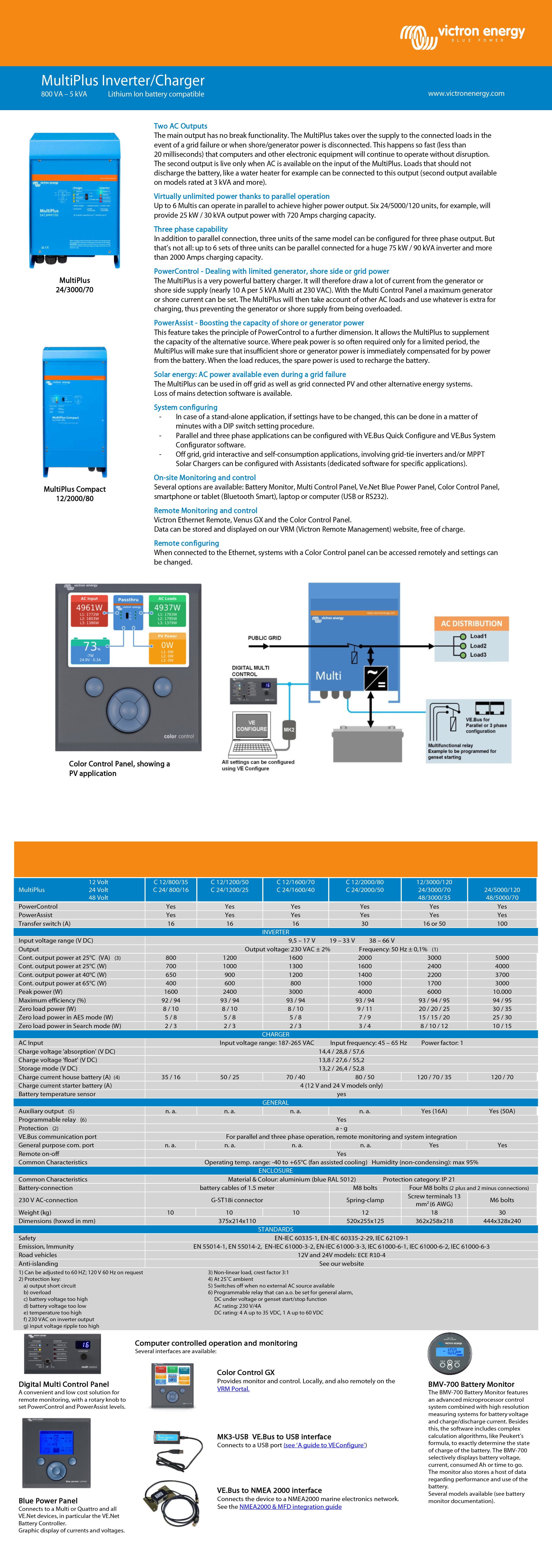 MultiPlus, adından anlaşılacağı üzere, tek zarif bir pakette birleştirilmiş bir invertör ve şarj cihazıdır. Birçok özelliğinden bazıları gerçek sinüs dalga invertörü, adaptif şarj, hibrit PowerAssist teknolojisi ve ayrıca çoklu sistem entegrasyonu özelliklerini içerir.