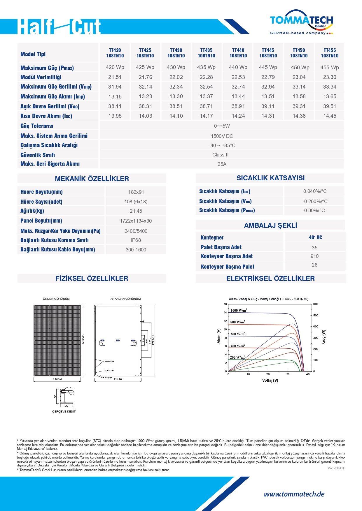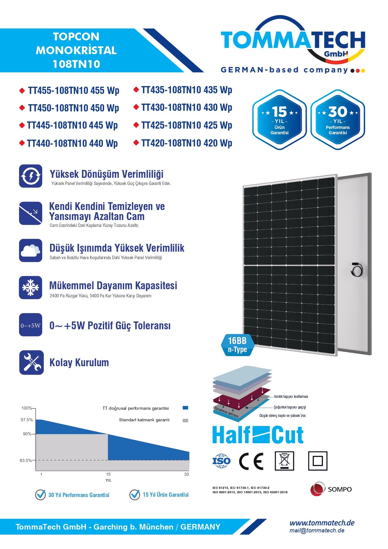 TommaTech® 450Wp 108TN M10 TopCon Güneş Paneli