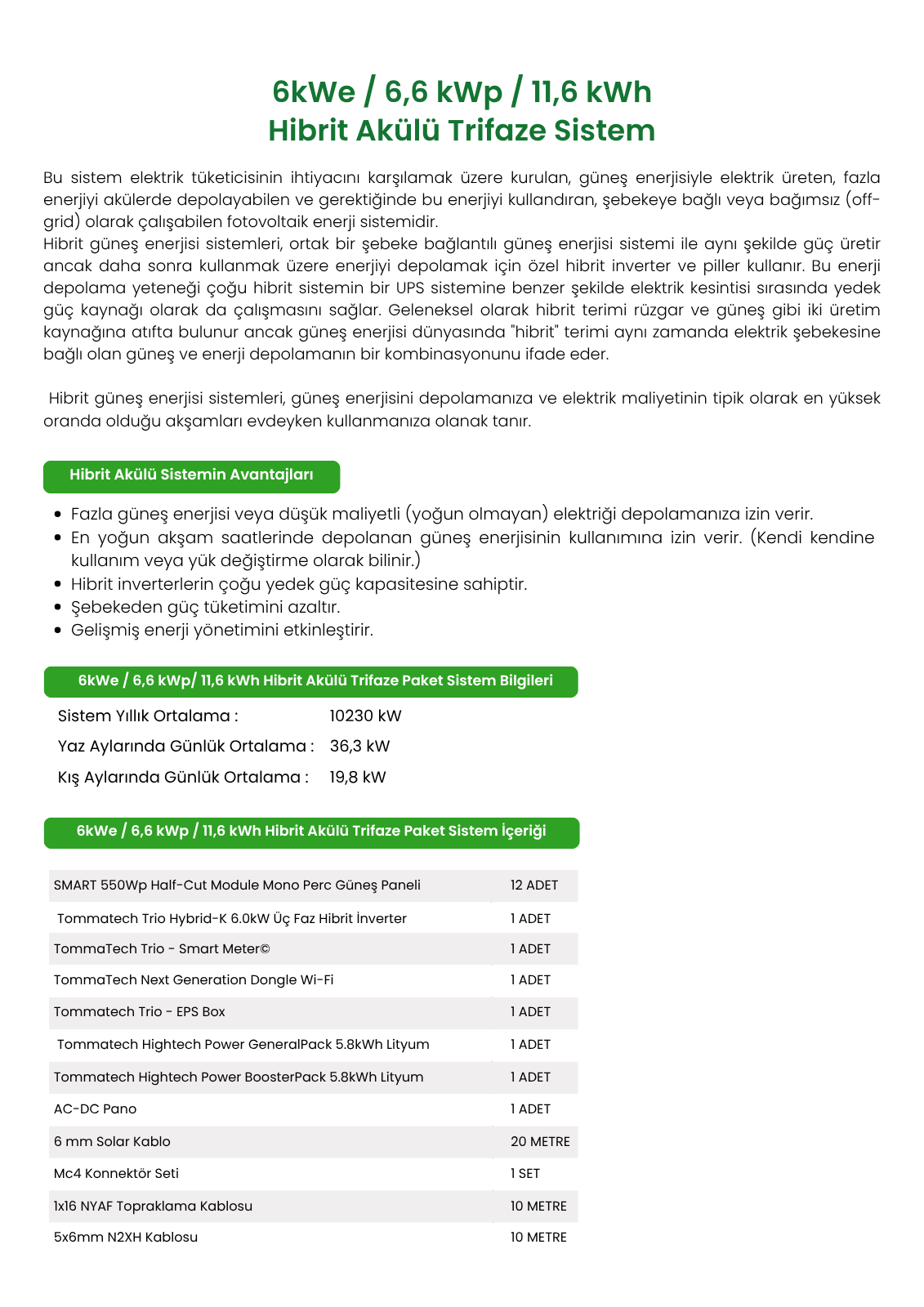 6kWe / 6.6kWp / 11.6kWh Hibrit Akülü Trifaze Solar Paket Sistem
