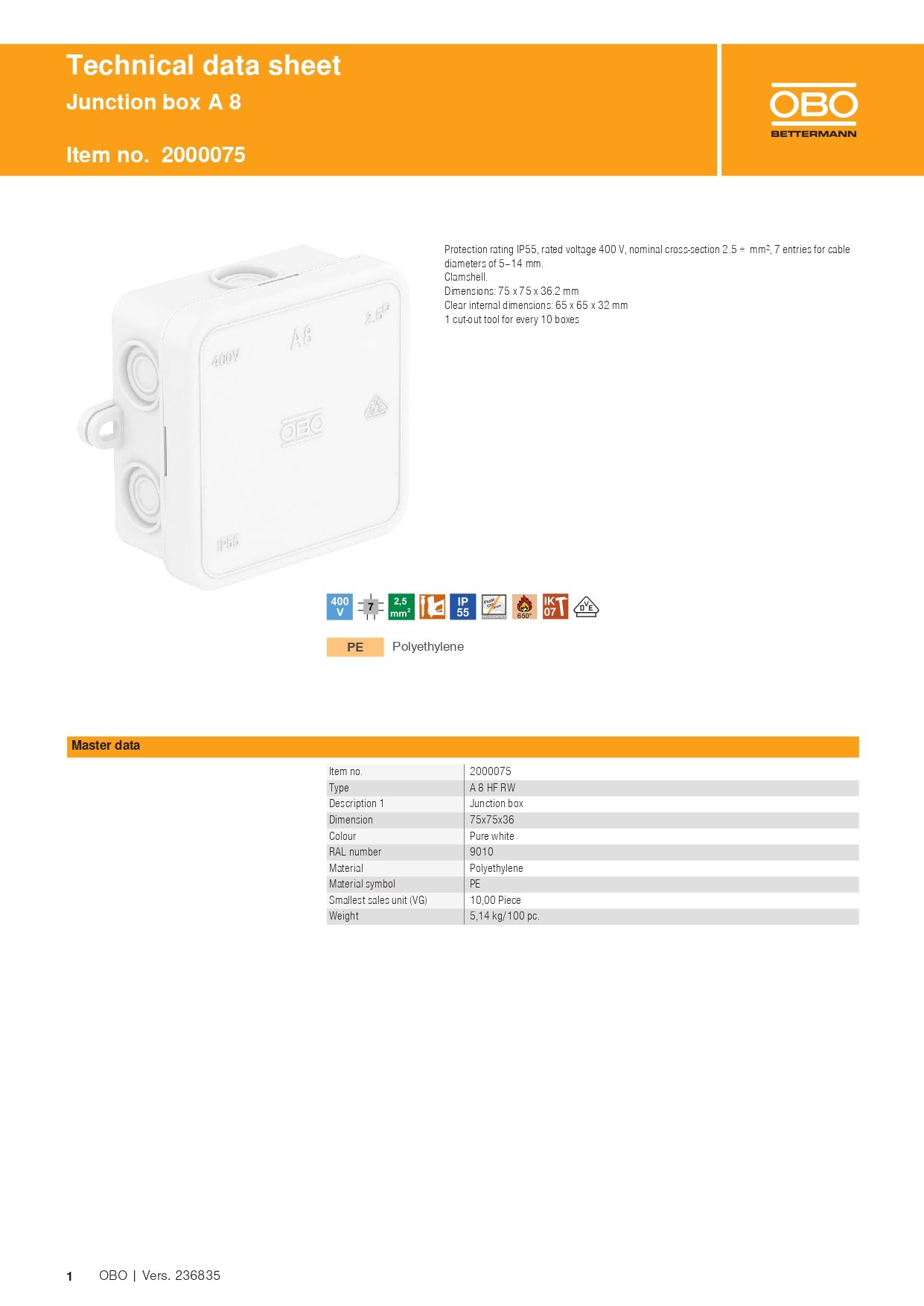 Koruma sınıfı IP55, nominal gerilim 400 V, nominal kesit 2,5 ÷ mm², 5‒14 mm kablo çapları için 7 giriş.