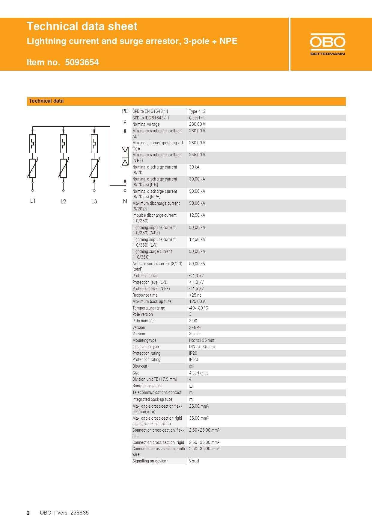 • Yıldırım akımı durdurma kapasitesi kutup başına 12,5 kA (10/350) ve toplamda 50 kA (10/350)