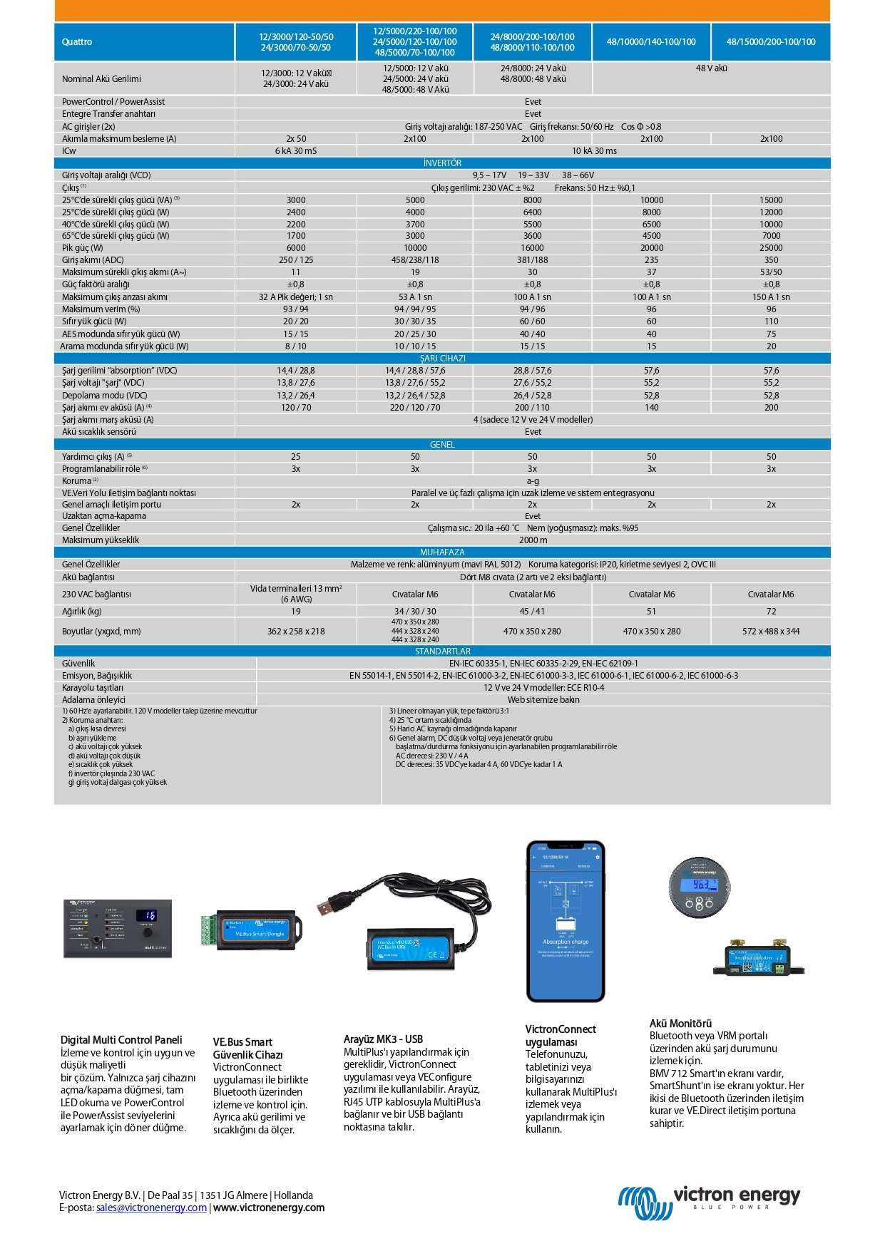 Daha yüksek güç çıkışı sağlayacak şekilde 6 üniteye kadar Quattro paralel olarak çalışabilir. Üç fazlı veya ayrılmış fazlı çalışma da mümkündür. Hangi modellerin paralel, üç fazlı ve ayrılmış fazlı kapasiteleri olduğunu görmek için lütfen veri sayfamızı kontrol edin.